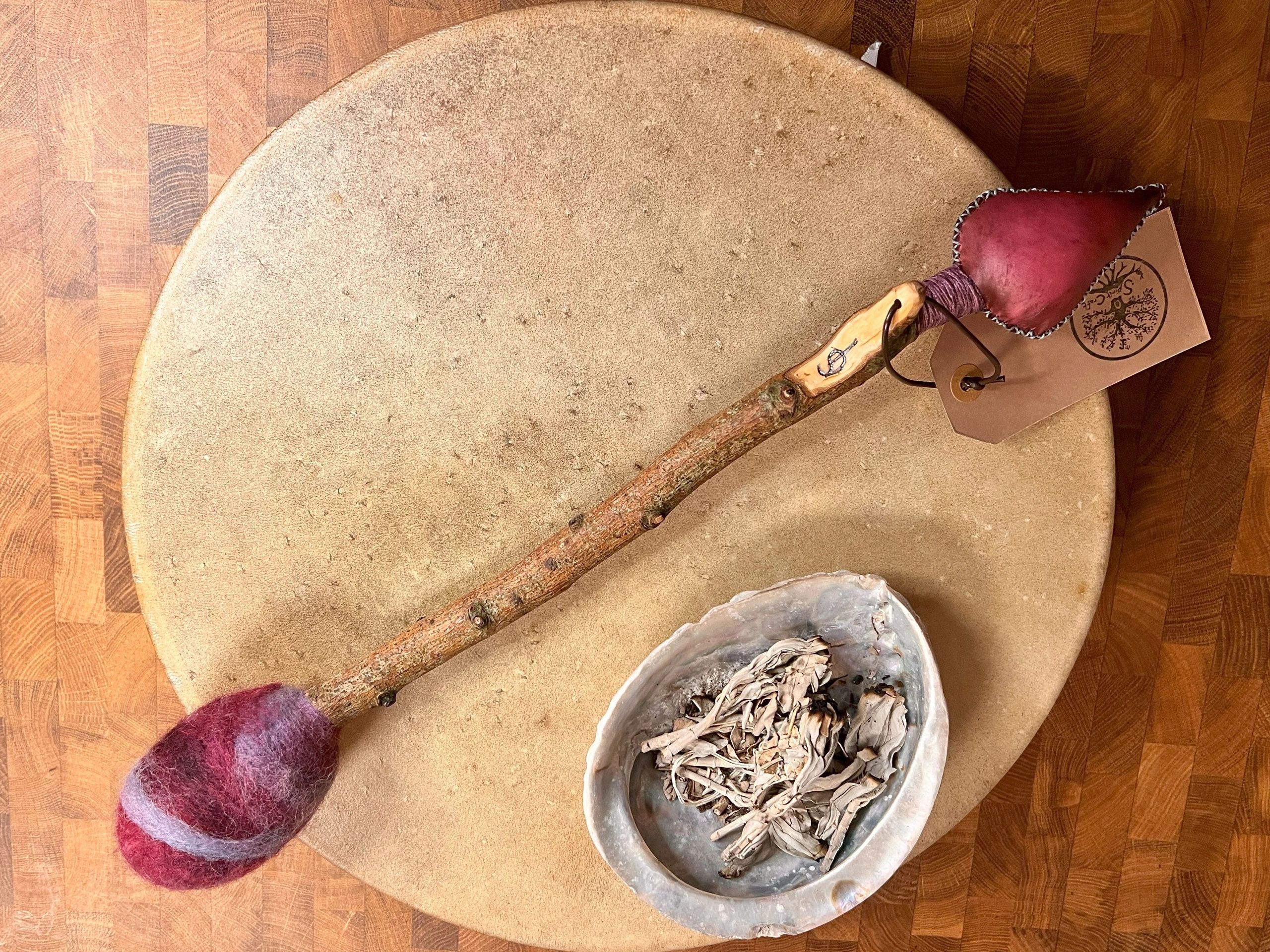 To support solitary journeying and deliver resonanace and tonal variation, we created the beater/rattle twin staff.